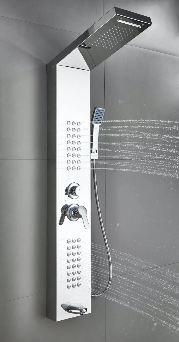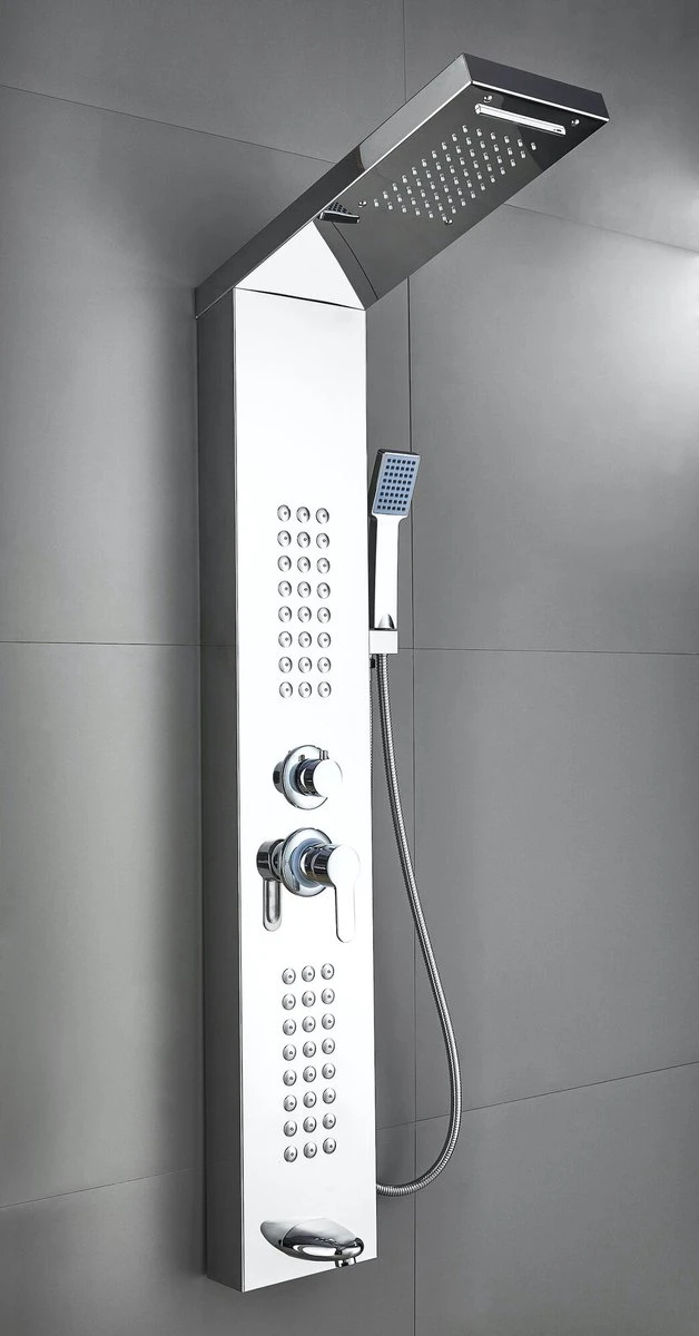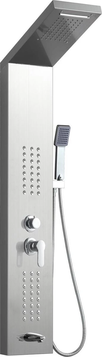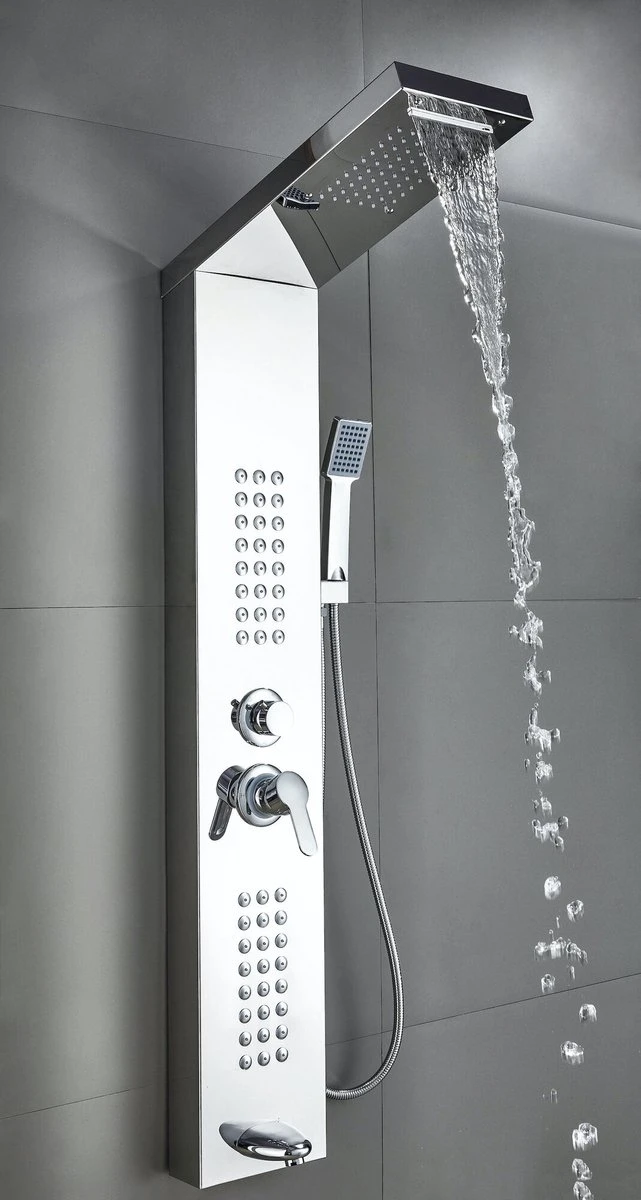 Douchepaneel Toulon is een douchepaneel gemaakt van roestvrij staal met een spiegelende afwerking. Het douchepaneel heeft twee massage units, een hoofddouche met watervalfunctie en een handdouche. Verder heeft het douchepaneel één draaiknop waarmee de vier douchestanden worden geregeld. Dit betekent dat maximaal twee verschillende standen tegelijk gebruikt kunnen worden. De andere draaiknop op het douchepaneel wordt gebruikt voor het regelen van de temperatuur door middel van een mengkraan.