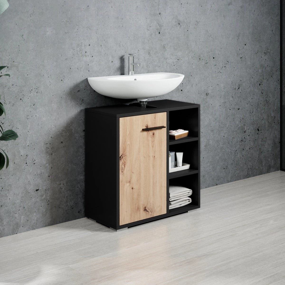 Badplaats Wastafel Onderkast Neptunus 60 Cm X 30 Cm X 60 Cm – Zwart Met Eiken – Badkamerkast – Staand Wastafelmeubel