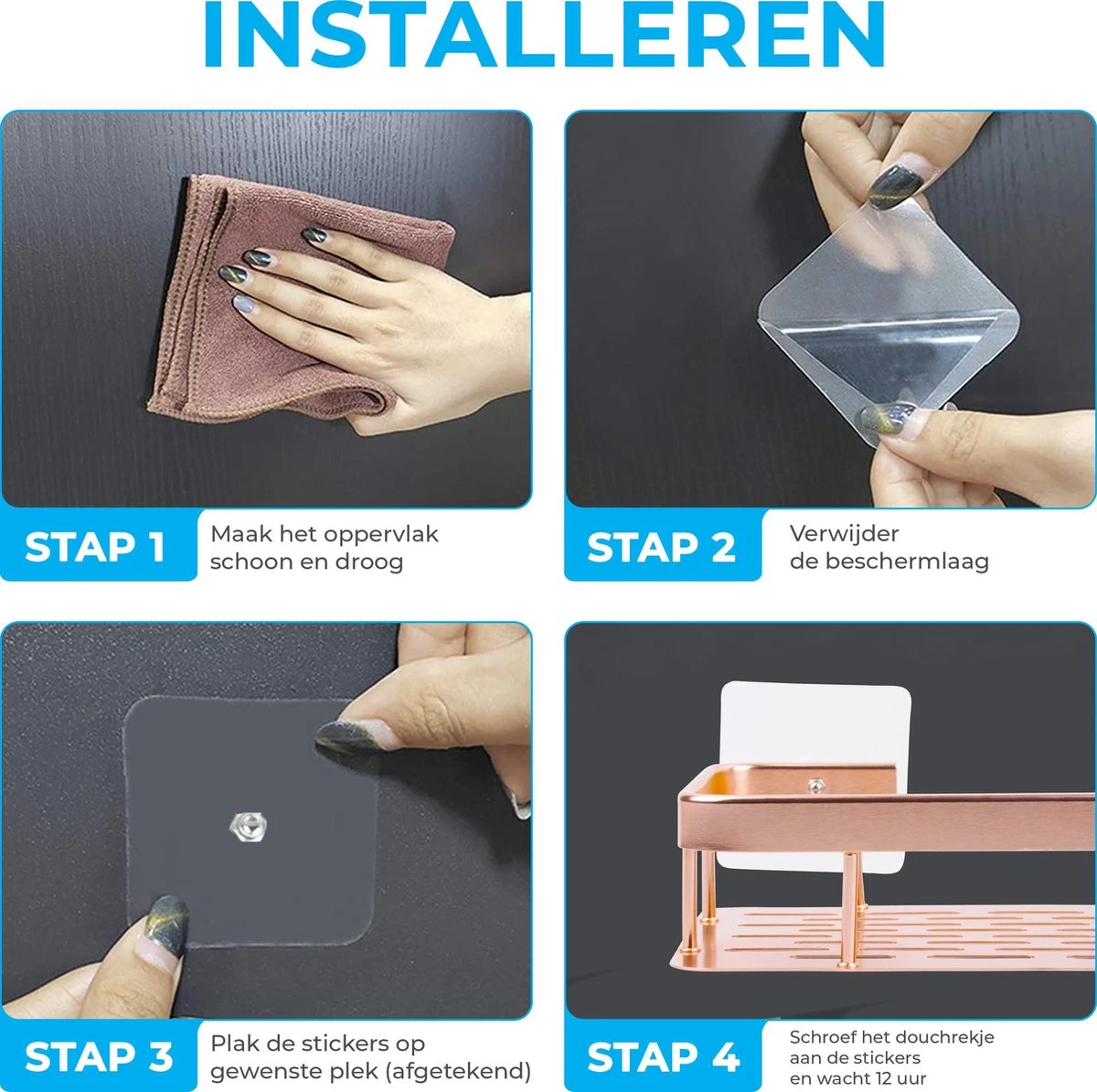 Het doucherek wordt geleverd met power lijm waarmee u het rekje met gemak kunt monteren. De power lijm is speciaal gemaakt voor vochtige ruimtes, zodat het doucherek stevig blijft hangen. De power strips werken het beste op gladde ondergronden zoals, glas, tegels, marmer of metaal. Een ander voordeel van de power strips is dat ze na verwijderen, geen lijm sporen achter laten.
