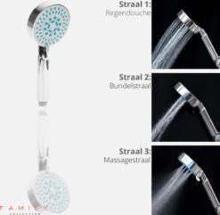 Moderne doucheset van Family Pound bestaande uit een douchekop, een 1,5 meter lange doucheslang en rubberen afdichtingen. De douchekop heeft meerdere functies zodat iedereen de juiste waterstraal kan vinden.