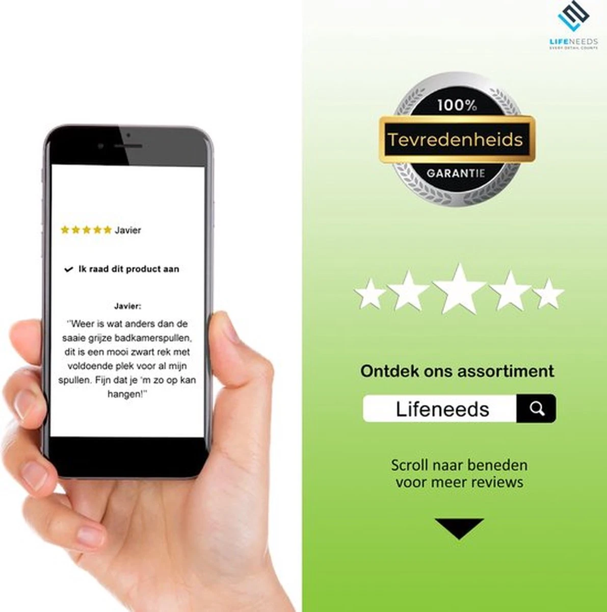 Het lifeneeds Doucherek is ontworpen om praktisch te zijn. Dit wil zeggen dat je hem snel en eenvoudig moet kunnen bevestigen aan je douchestang of kraan. Het klemsysteem zorgt ervoor dat het doucherek stevig blijft zitten en niet loskomt bij te zwaar gewicht van bijvoorbeeld meerdere shampooflessen.