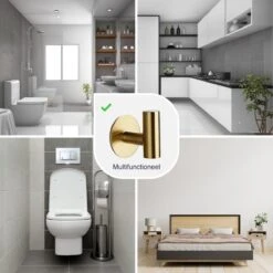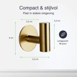 Handdoeken, theedoeken, vaatdoeken, als je ze gebruikt moeten ze droog en schoon zijn. Met deze handige ophanghaken, die je dankzij de sterke plakstrip makkelijk op een muur of kastje kunt plakken, heb je altijd een plekje om je doeken op te hangen. De zelfklevende haakjes zijn gemaakt van RVS, goud van kleur en eenvoudig te monteren. Je hoeft er namelijk niet voor te boren. Een must have voor je badkamer of keuken.