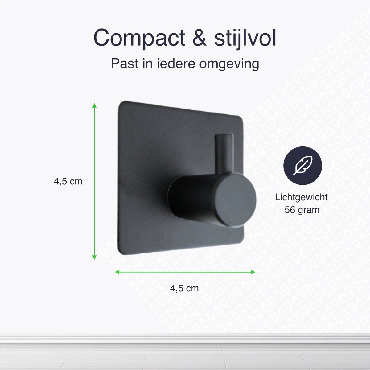 Het design van de haakjes, die 45 bij 45 mm zijn, is simpel en strak. Doordat de haakjes van zwart roestvast staal gemaakt zijn, hebben ze de perfecte look voor bij een modern interieur. Maar ook zijn de haakjes uitstekend te combineren met interieurs die veel industriële elementen hebben.