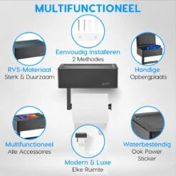 - Verpakking inhoud: 1x wc rolhouder zwart, 1x bakje met plankje, 1x Power Sticker, 1x Set Schroeven, 1x Installatiehandleiding