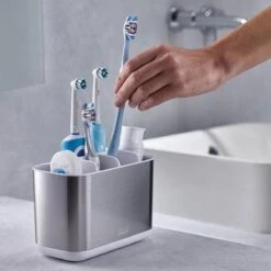 Naast je handtandenborstel passen ook elektrische tandenborstels en andere badkameraccessoires in de opberger. Zet het tandenborstel bakje neer op je wastafel of zet hem uit het zicht in een van je badkamerkastjes. De houder is makkelijk uit elkaar te halen zodat het bakje goed schoongemaakt kan worden. Ook is er een ventilatiegat aanwezig waardoor de houder snel opdroogt als er waterresten van de tandenborstels afkomen. Vanaf nu kunnen je badkameraccessoires schoon en gestructureerd opgeborgen worden! Maak je set compleet met andere badkamer opbergers uit de EasyStore collectie van Joseph Joseph.