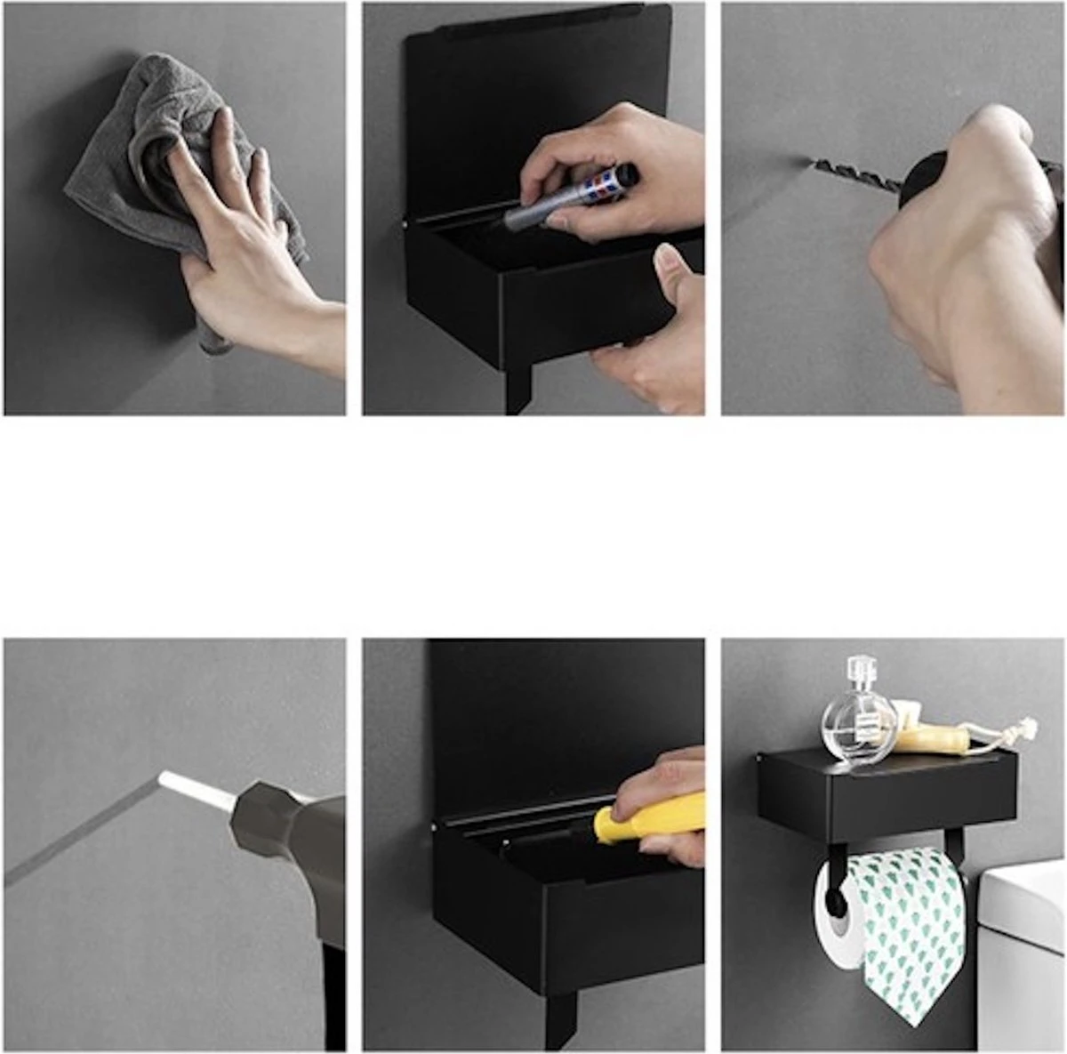 De wc-rolhouder maakt de installatie eenvoudig en heeft een soepel rollende beugel en stevige opbergdoos. Er worden instructies, schroeven en ankers voor muurmontage meegeleverd en de houder kan in enkele minuten worden opgehangen. Hierdoor voeg je snel elegantie en praktijk toe aan je badkamer.
