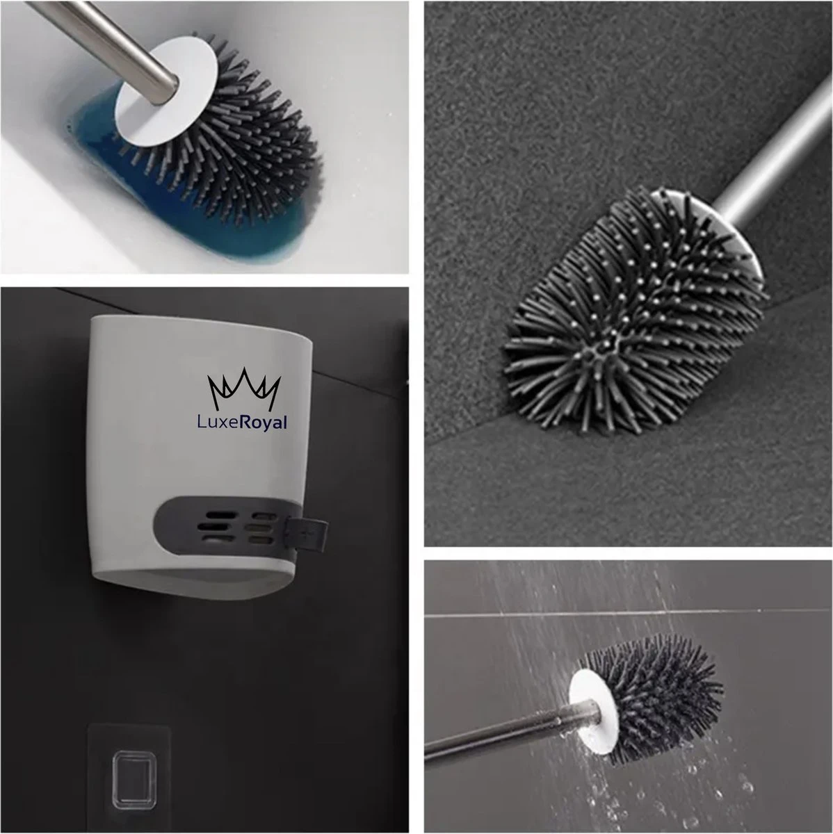 De toiletborstelhouder heeft een gleuf aan de zijkant en aan de houder zit een zelfklevende haak waarmee deze aan de muur kan worden bevestigd. De compacte toiletborstel en houder kunnen ook op de grond blijven staan als u dit prefereert. Het is uw vrije keuze! De LuxeRoyal toiletborstelhouder heeft een verborgen ventilatieontwerp, waardoor hij handig kan worden gereinigd, gedroogd en afgevoerd. Het ontwerp van de houder en borstel zijn strak waardoor hij mooi in uw toilet of badkamer staat.
